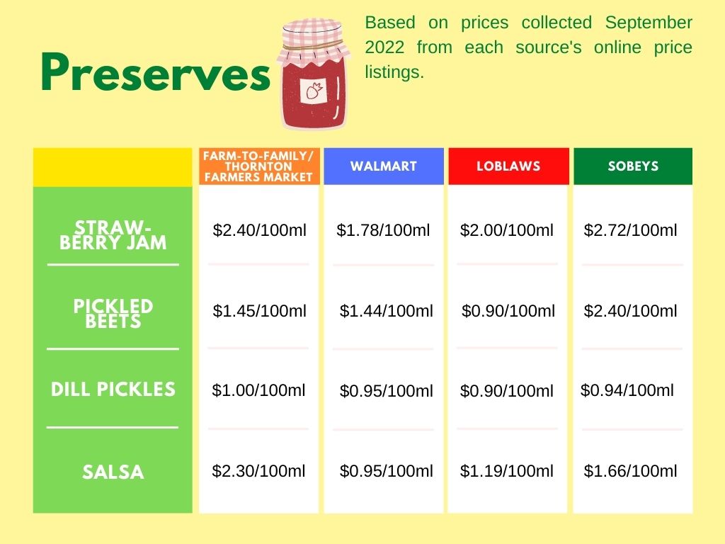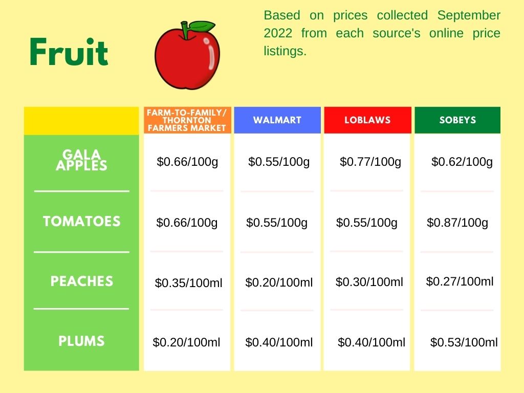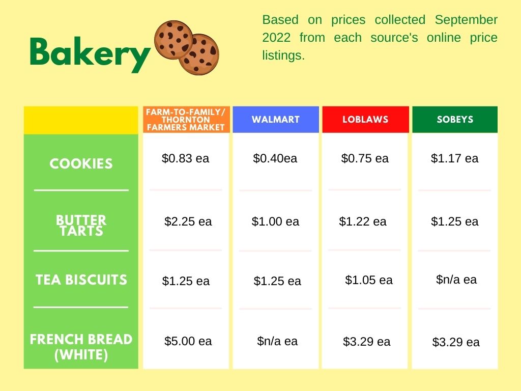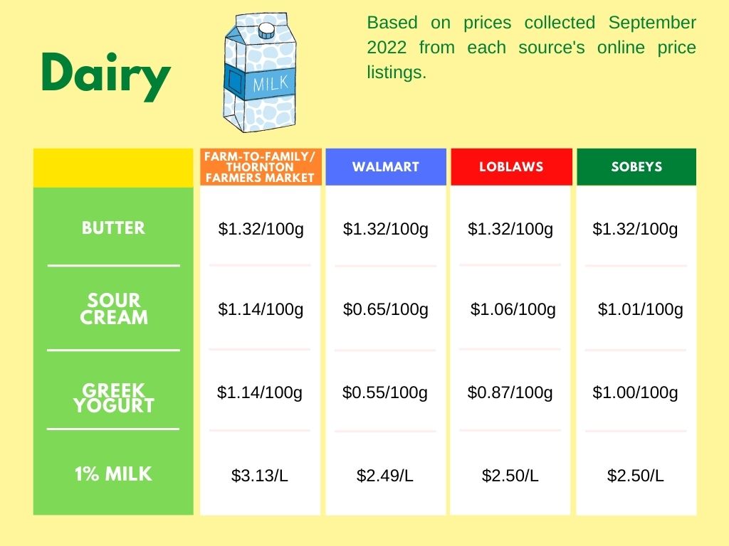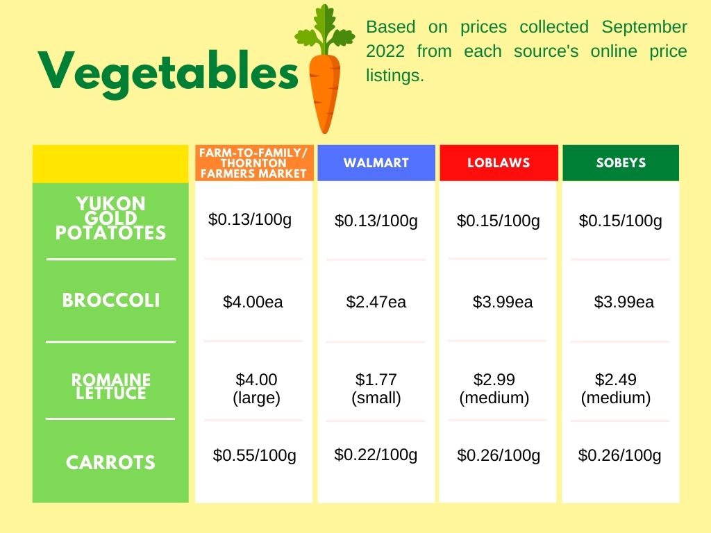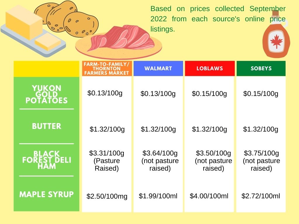 Here’s a comparison of some of the big local grocery store prices that I found online in September 2022 with the prices I see at the Thornton Farmers’ Market in Ontario and at Farm-to-Family – Local Fare Barrie (an online order/curbside pickup farmers’ market consisting of many of the same vendors as the Thornton Farmers’ Market, as well as several others).